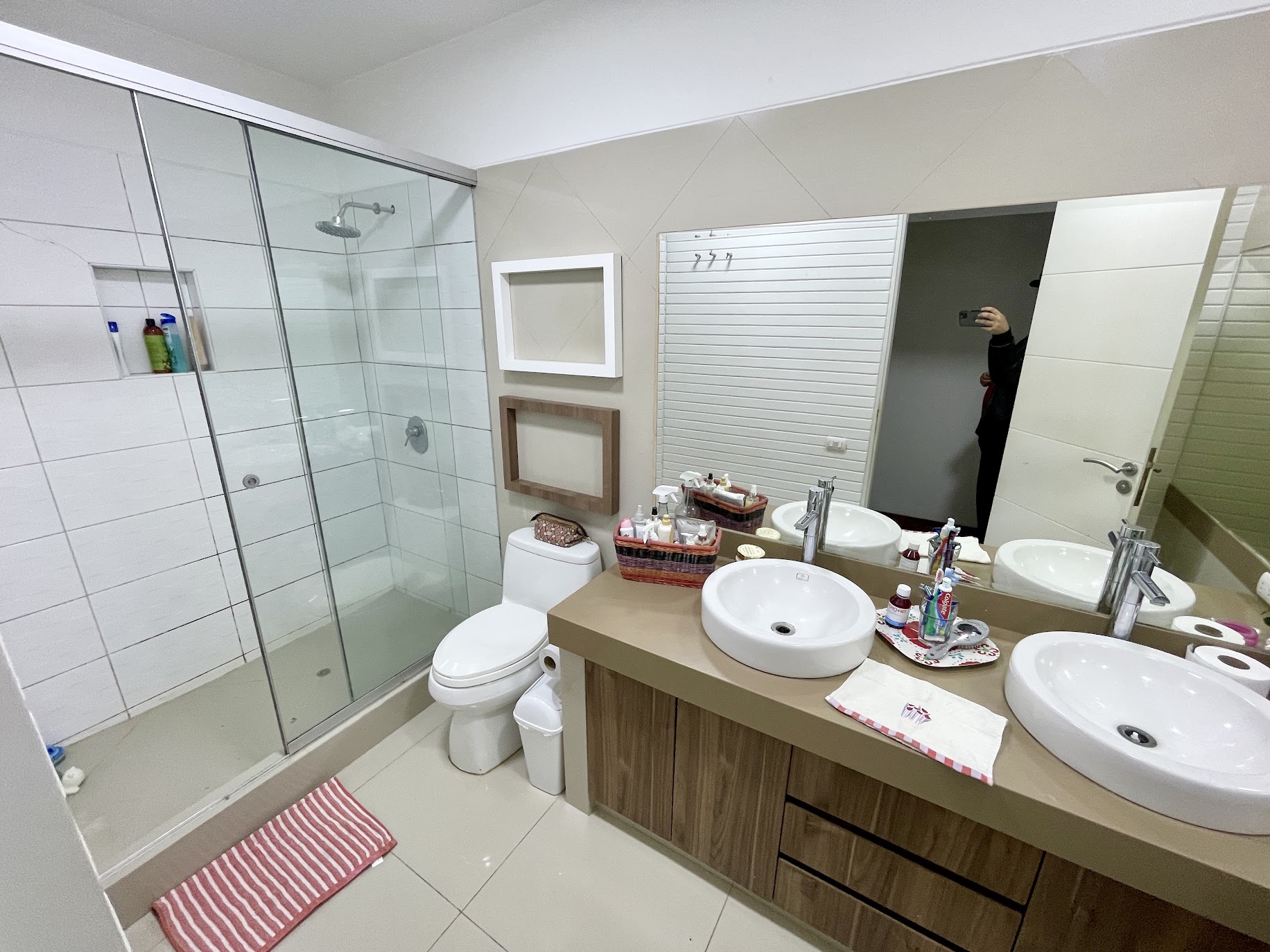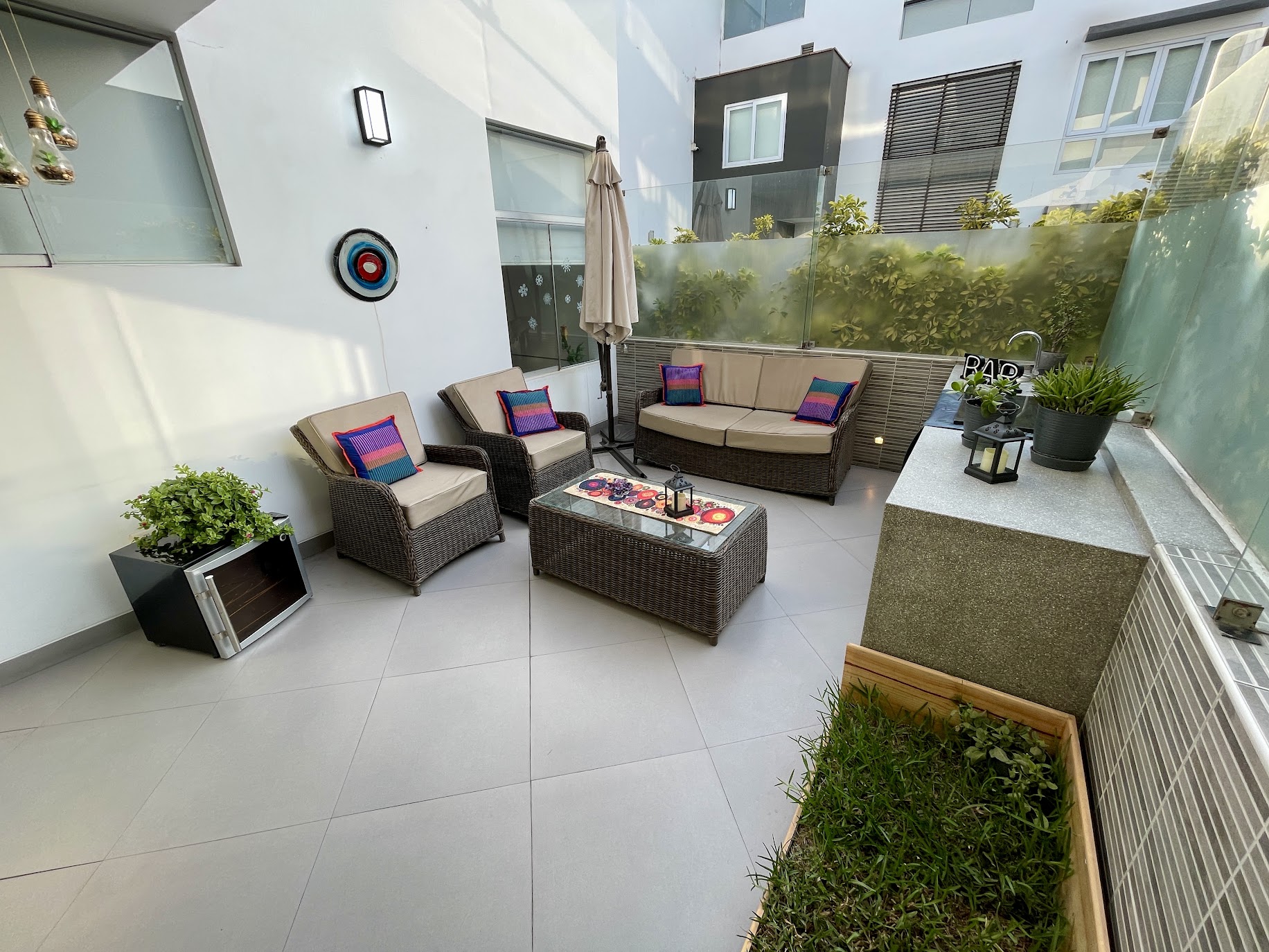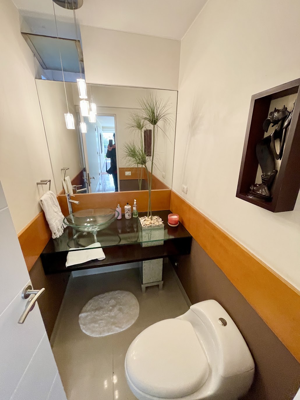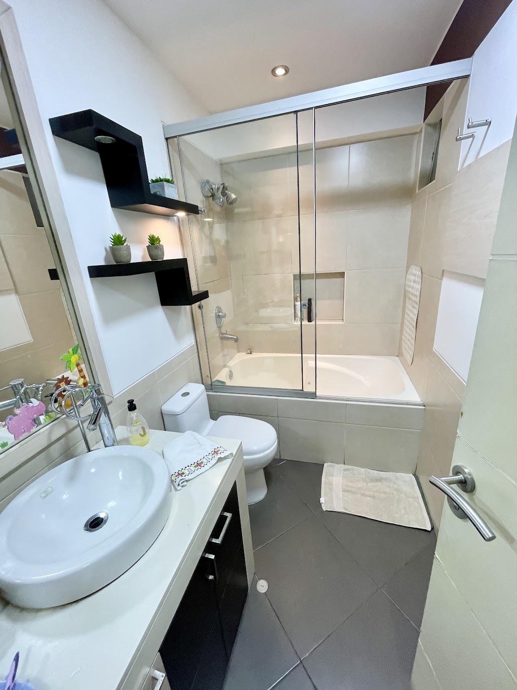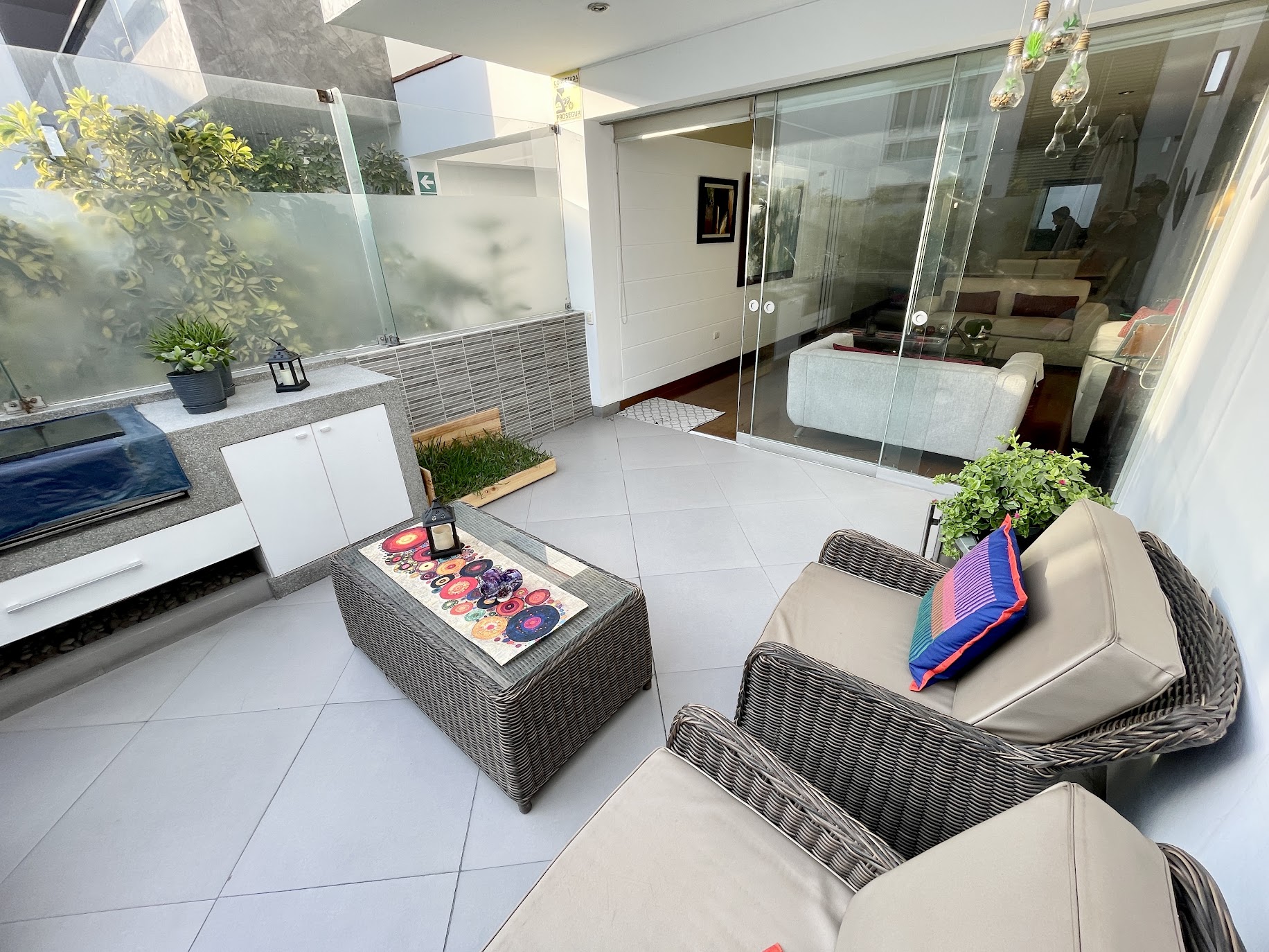Cuenta con un fino mueble tipo vitrina de lindo diseño muy acorde al ambiente, mamparas que interactúan con la terraza ideal para parrillas.