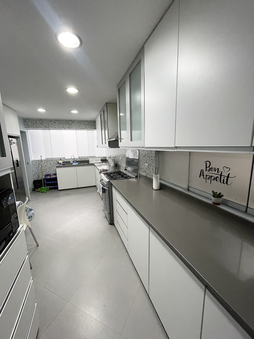 Cocina y Lavandería, muy amplia con finos acabados, tablero de granito, alacena, comedor de diario, encimera, campana, todo a gas, area de servicio completo, cuarto y baño de servicio.